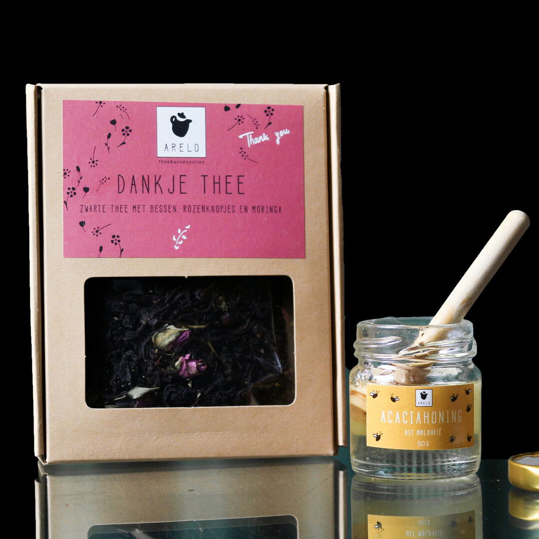 Wat dacht je van een lekker theetje als bedankje? Met deze speciale ‘dankje thee’ kun je op een originele manier je dank uiten. De intacte rozenknopjes en besjes evenaren een mooi bosje bloemen. Een origineel en heerlijk bedankje, speciaal voor jou, omdat je het verdient!