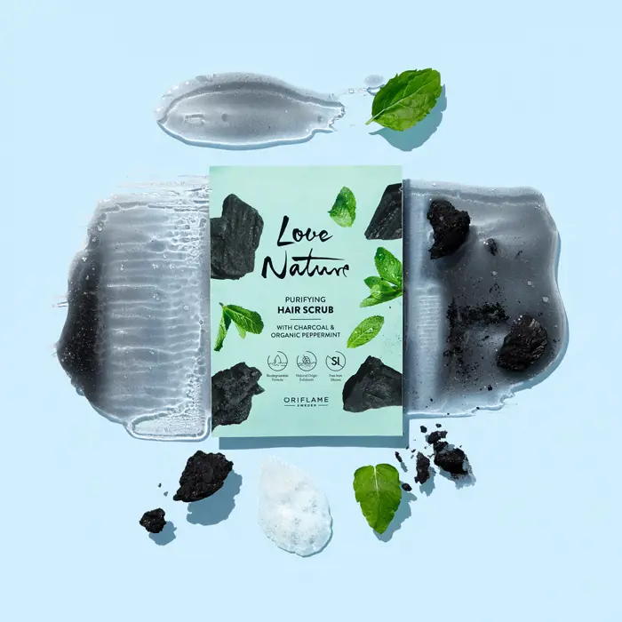 Verwen je haar en hoofdhuid met een exfoliërende en zuiverende scrubbehandeling, met houtskool en natuurlijke, biologische pepermunt.